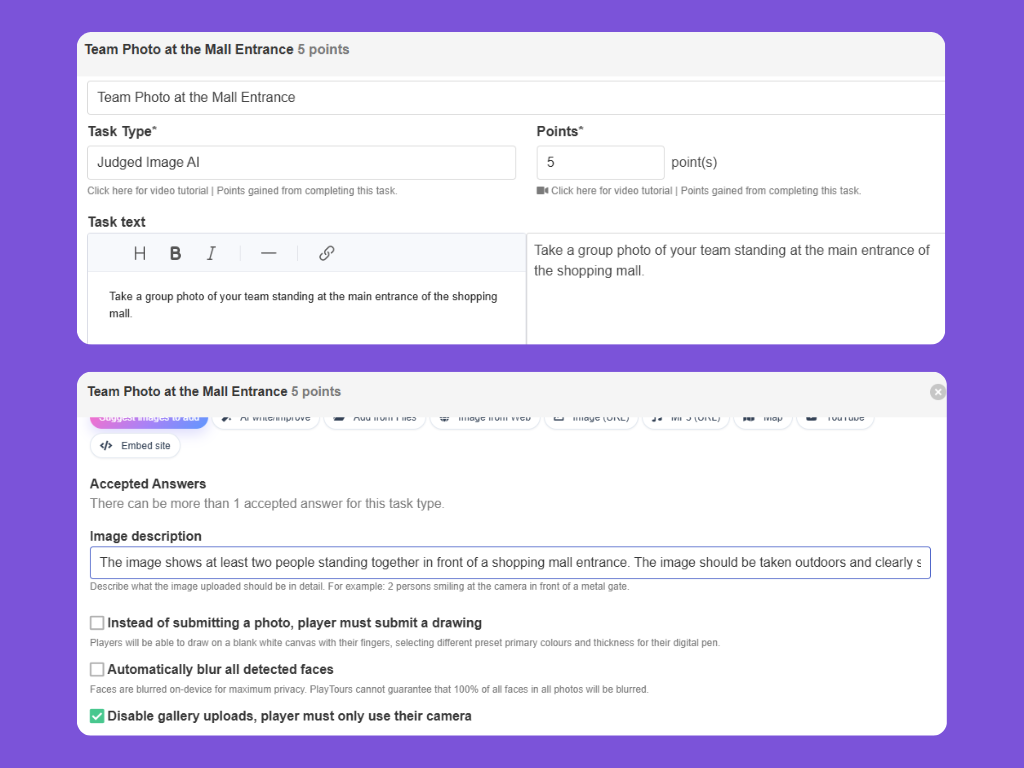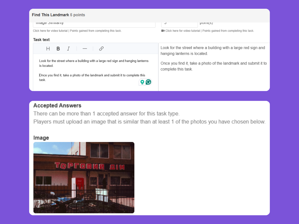Players upload a photo, and their answer is checked against the reference images you uploaded. The player’s photo must look like the same place or object as your image. The task is completed if the images are visually similar.