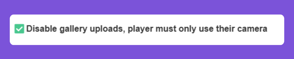 To ensure photos are taken on-site and in real time, enable the setting to disable gallery uploads. This forces players to use their device camera and prevents uploading old or downloaded images.
